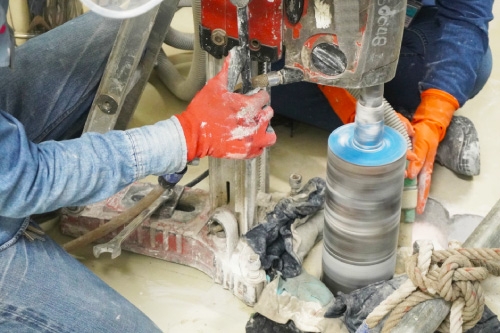 水を併用する湿式コアボーリングは、粉塵を抑制しながらコア抜きが可能で、長時間の穿孔作業でも精度と作業者の安全性を確保します。